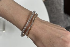 ゴールドのミラーボールが輝くバネ状の形状記憶ブレスレットは着脱しやすく、それ自体とても人気のアイテムですが、これに2本のテニスブレスレットを固定することでチェーン部分の断裂を防ぎ、安心感のあるダイヤブレスレットになりました。