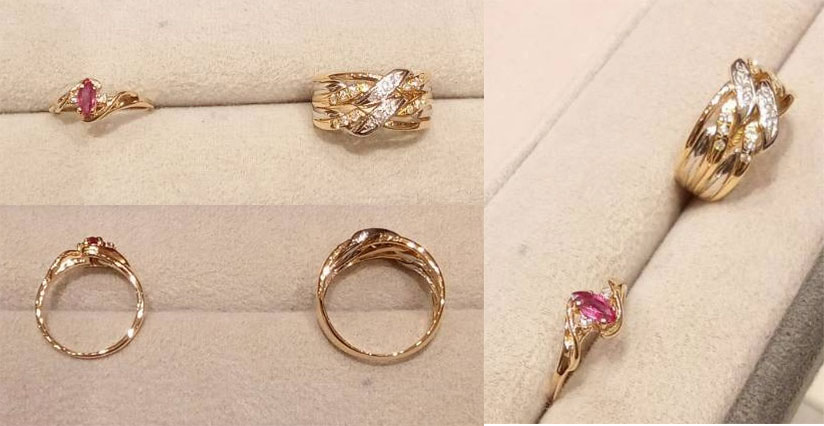 ゴールドとプラチナのコンビが華やかなボリュームリングと、ピンクのカラーストーンが可憐なK14のリングです。