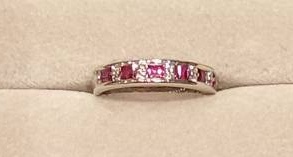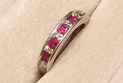 鮮やかな赤のカラーストーンが並ぶプラチナのエタニティリングをお持ちになったお客さま。